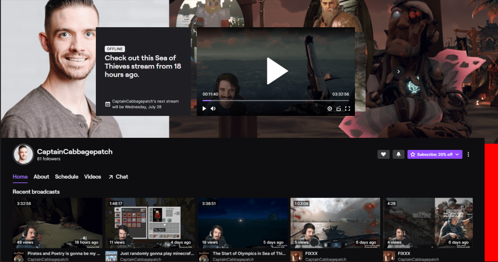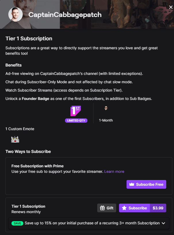 Fun fact about Twitch, it is owned by Amazon and when you want to enhance your experience when watching a creator on Twitch you can use your hard-earned cash to pay for a subscription to the creator. This unlocks special bonuses for you and helps grow that streamer’s(aka my) community. HOWEVER, if you have Amazon Prime you get one free subscription to any creator on the platform that you choose! It doesn’t cost you any extra, and it greatly benefits the content creator with a little extra dough.
